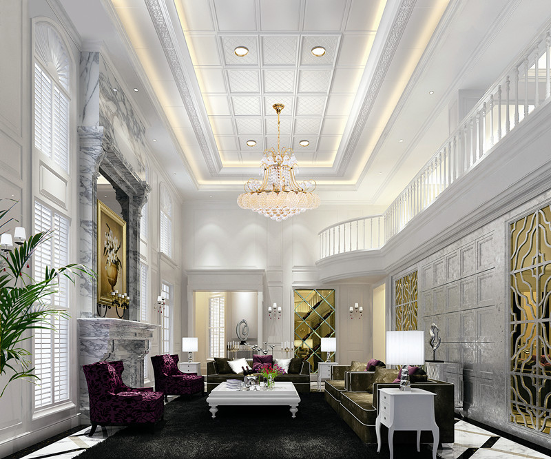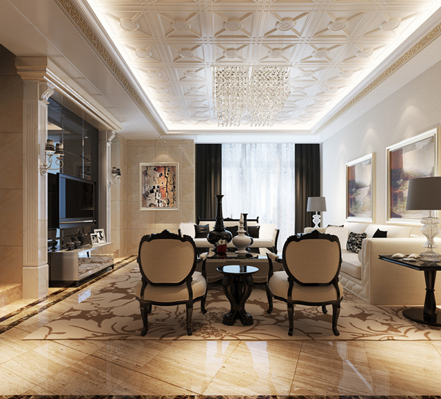 大面積白色的客廳吊頂布局使空間顯得簡約大氣。層層遞進的躍層造型,有助于實現輕松、隨意的生活方式。中央區域帶有精美紋飾的板材與燈帶的點綴,增添了空間的美感與情調,又豐富了客廳的藝術內涵。