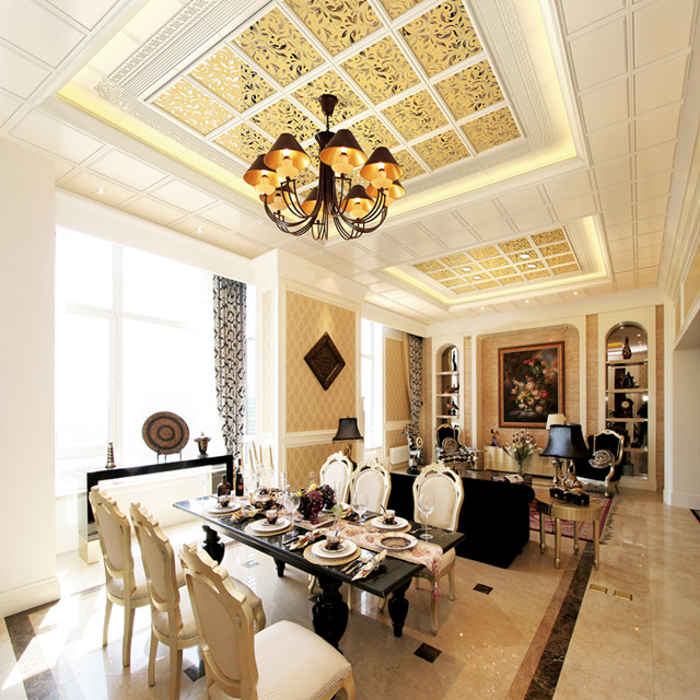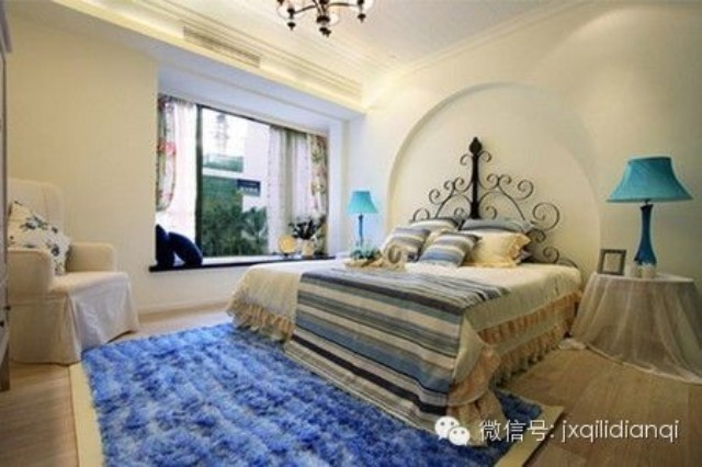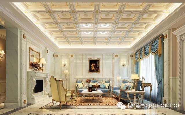 美式古典風(fēng)格在空間上追求連續(xù)性,追求形體的變化和層次感。這個(gè)房間以美式古典宮廷風(fēng)格為主,以復(fù)古的白色和金色為基調(diào)。室內(nèi)外高貴典雅,光影變化豐富。為體現(xiàn)宮廷風(fēng)格,家具、門(mén),窗都漆成白色,藍(lán)色的布藝沙發(fā),金色的畫(huà)框壁畫(huà),金色系的地毯,帶有一種異域的視覺(jué)沖擊。用壁爐的造型打造的電視柜使得一家人看電視時(shí)的感覺(jué)更為溫馨。