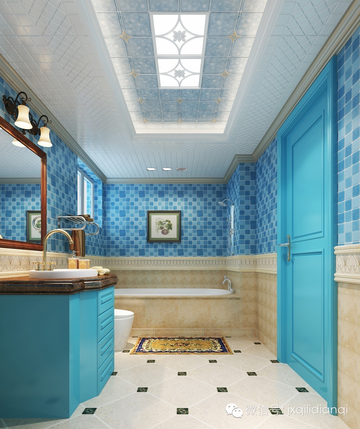 衛(wèi)浴間的設(shè)計(jì)也是非常清爽,在追求時(shí)尚個(gè)性的今天,人們對(duì)于家居的裝修上也非常講究獨(dú)特性。無(wú)論浴室是大是小,只要通過(guò)悉心的打扮,便可以凸顯另一番如畫(huà)的風(fēng)景。衛(wèi)浴間運(yùn)用清爽的藍(lán)色,黃色的浴缸外邊更是顯示了地中海的風(fēng)格,色調(diào)不一的藍(lán)色墻磚和頂上的淺藍(lán)吊頂遙相呼應(yīng),猶如藍(lán)色海洋,在這樣的藍(lán)色環(huán)境下泡澡,別有一番風(fēng)味。