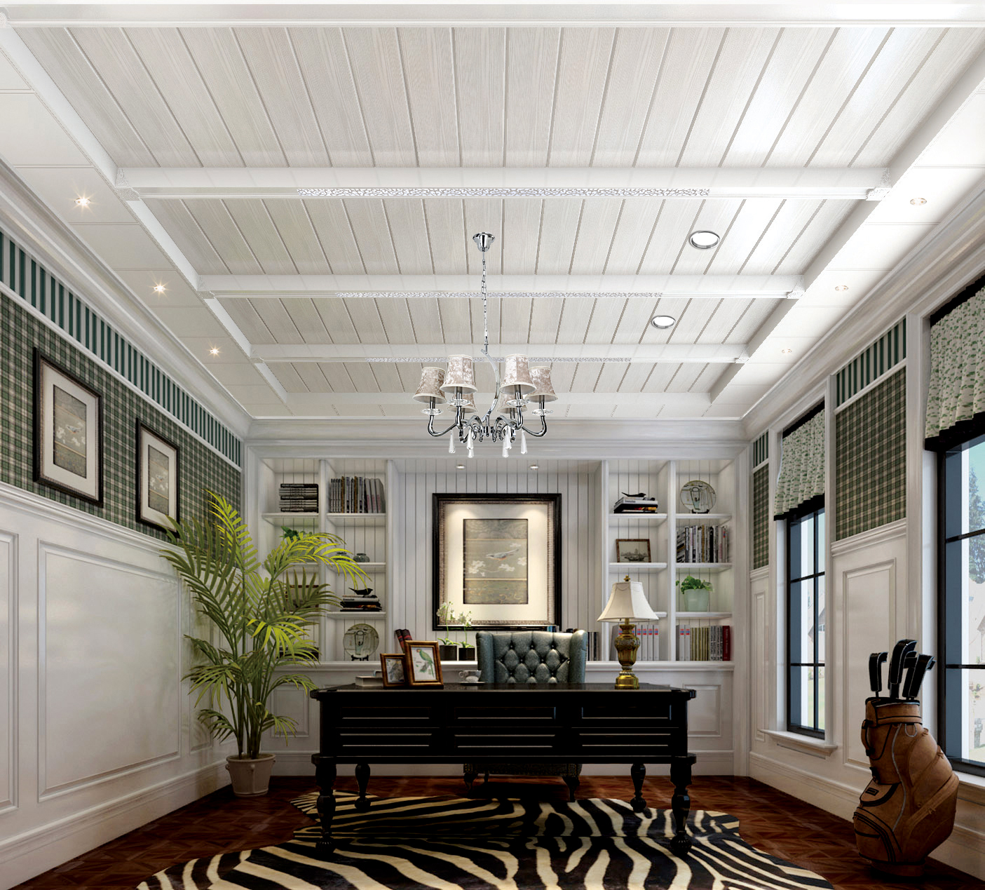 簡約美式風格的書房,簡潔明了,室內采用一色的灰白樣式,吊頂采用橫木樣式的,邊上裝上幾個小筒燈,使之書房增加明亮度。采用抽象繪畫和雕塑來裝飾,打破一些乏味、單調、生硬的線條,以期獲得完美豐富的空間感受。在這樣的書房,你的思緒是不是也會多一點呢?