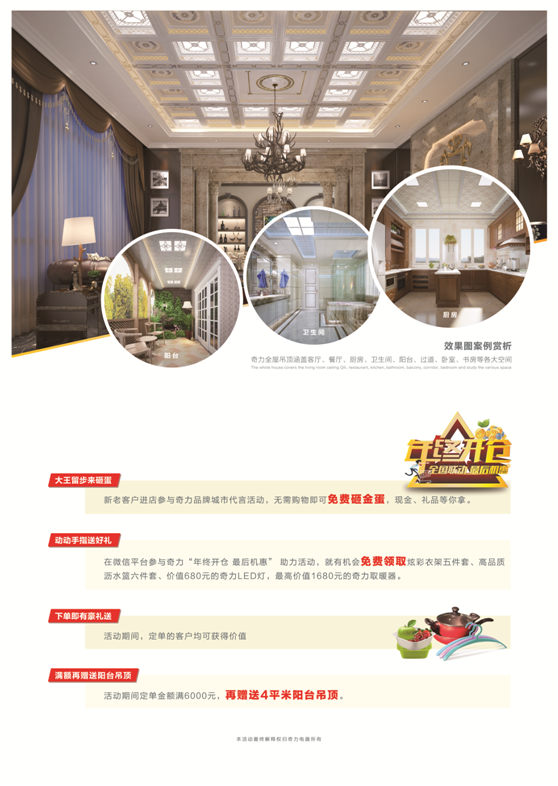 這場(chǎng)震驚吊頂行業(yè)的奇力集成吊頂“全國(guó)聯(lián)動(dòng)”大型促銷(xiāo)活動(dòng),將于12月10日起正式拉開(kāi)帷幕,一次持續(xù)21天的家裝盛宴將暴風(fēng)驟雨般在全國(guó)300余家奇力吊頂專賣(mài)店開(kāi)始上演,21天,504個(gè)小時(shí),30240分鐘,每一分鐘都將飽含奇力人對(duì)經(jīng)銷(xiāo)商、終端客戶的最熱忱的服務(wù)和最誠(chéng)摯的問(wèn)候。21天,不要徘徊,不要猶豫,因?yàn)椴还苋叨唬阕罱K會(huì)將奇力的產(chǎn)品帶回家,廠家“年終開(kāi)倉(cāng)”,這是2016年“最后機(jī)惠”。